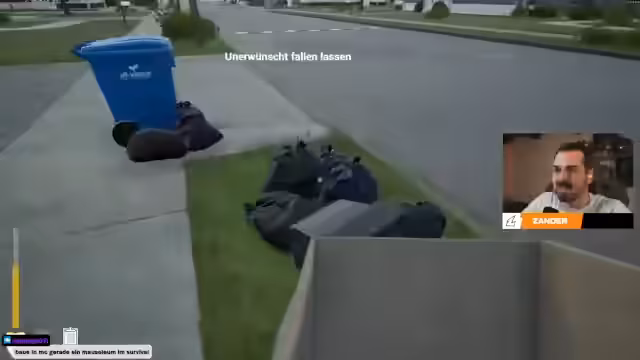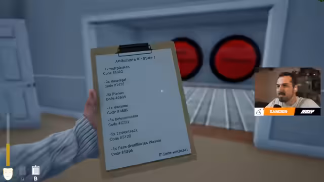 03:03:51Der Streamer beginnt mit dem Einkauf der ersten Materialien im In-Shop des Spiels. Er muss unter anderem Holzplanken, Planen, Baunägel, Zement und Wasser mit spezifischen Codes erwerben. Dieser Prozess wird als sehr umständlich und aufwendig beschrieben, da jedes Paket einzeln transportiert werden muss. Die Handlung wird dabei immer absurder, da die Frau des Charakters am Fenster steht und das Geschehen beobachtet.