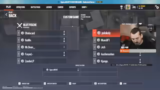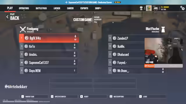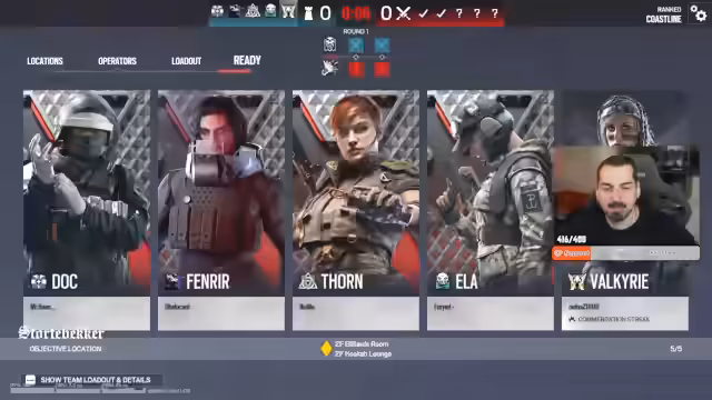 00:14:00Nachdem die technischen Vorbereitungen abgeschlossen sind, beginnt die erste offizielle Spielrunde auf der Map Bank. Das Team 'Blutfische' startet ins Match und diskutiert über Spielstrategien und Operator-Selects. Es wird erwähnt, dass Maps wie Bank und Montoya bevorzugt werden und der Clan 'Demons' der erste Gegner ist. Das Match ist geprägt von taktischem Vorgehen, dem Platzieren von Cams und dem Scannen des Gegners durch Valkyrie, um deren Positionen aufzudecken.