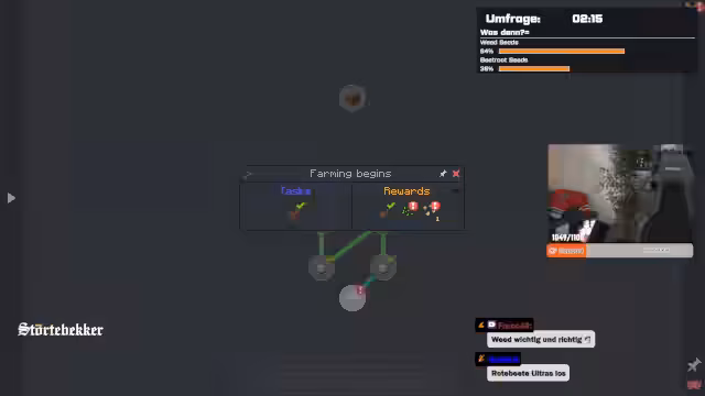00:00:58Der Stream beginnt mit persönlichen Anekdoten des Streamers, der aufgrund einer schlaflosen Nacht erst spät ins Bett ging und von einem Albtraum seines Kindes Elias aufgewacht wurde. Nach seinem morgendlichen Ritual, das das Gießen von Tomaten und Gurken beinhaltet, macht er sich Gedanken über den geplanten 12-Stunden-Stream. Er zeigt eine Discord-Umfrage, die er neun Stunden zuvor erstellt hat, um das Publikum über die Spielauswahl abstimmen zu lassen. Diese enthält eine Vielzahl von vorgeschlagenen Titeln wie Star Wars Battlefront 2, Crusader Kings 3 und The Witcher 3, wobei Minecraft aktuell in Führung liegt.