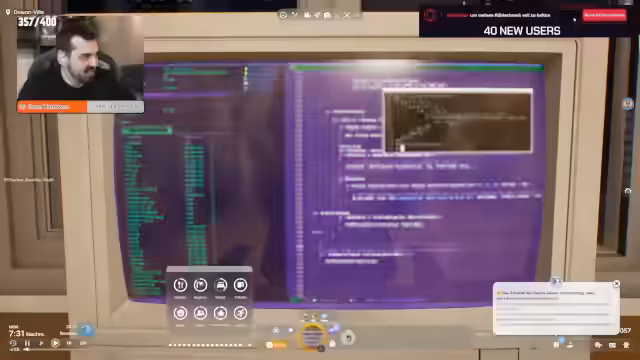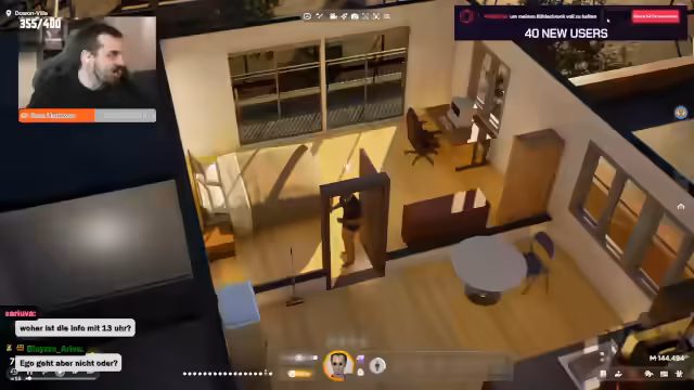 01:52:12Nachdem die grundlegende Erkundung der Welt stattgefunden hat, widmet sich der Streamer dem Alltagsleben. So wird ein Frühstück zubereitet und die grundlegenden Bedürfnisse des Charakters wie Hunger, Hygiene und Toilette gedeckt. Zudem wird der Weg zur Karriere gesucht und eine Anstellung bei der Feuerwehr in Doron angenommen. Das Spiel hat einen Terminplan, der den Arbeitsplatz automatisch einträgt und die Tagesstruktur des Charakters vorgibt.