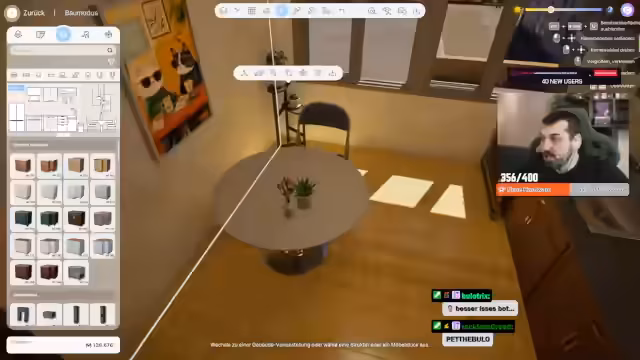 01:00:31Nachdem das erste Möbel im Haus platziert wurde, wechselt der Streamer in den Baumodus. Er erkundet die umfangreichen Möglichkeiten, das Haus umzugestalten. Mithilfe des Pink Studio kann er die gesamte Einrichtung des Hauses mit einem Klick für 16.000 Miau ändern. Anschließend geht er zurück in den normalen Baumodus, um einzelne Möbel zu platzieren, zu drehen und die Materialien und Farben anzupassen. Er stellt fest, dass die Gestaltungsmöglichkeiten sehr detailliert sind und zeigt die Vielfalt an Möbeln, von Lampen über Pflanzen bis hin zu Uhren, die die richtige Zeit anzeigen.
