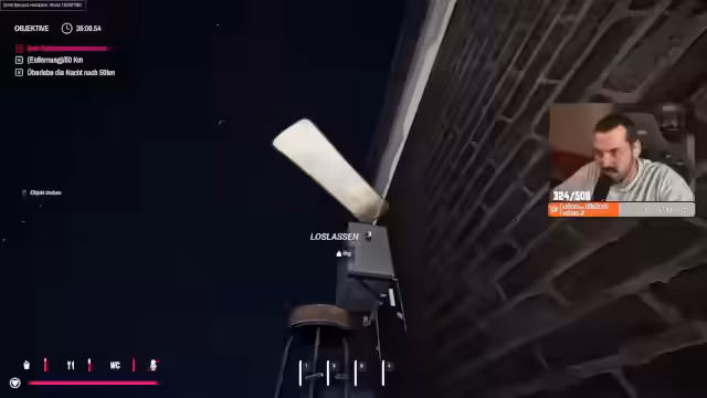 01:56:50Während der Erkundung des Geländes unternimmt der Streamer verschiedene Sprünge und versucht, Hindernisse wie Zäune zu überwinden. Er begeistert sich für seine eigenen Parkour-Fähigkeiten und versucht, strategisch vorgehen, um auf Dächer und andere hohe Punkte zu gelangen. Dabei setzt er eine Leiter ein, um auf das Dach eines Gebäudes zu klettern, und versucht, einen Turbolader zu finden.