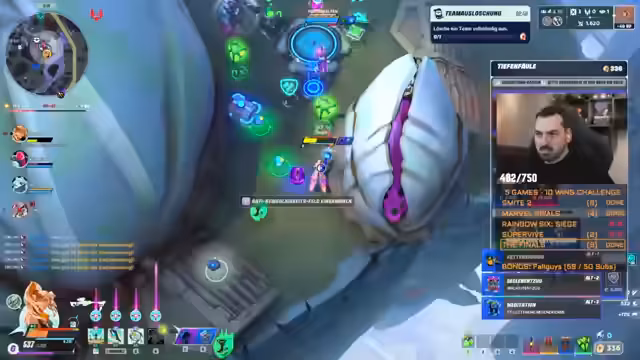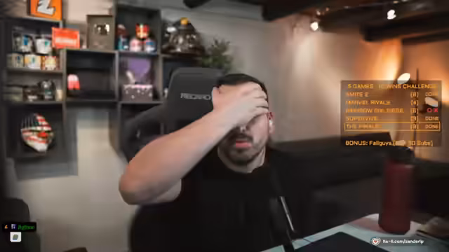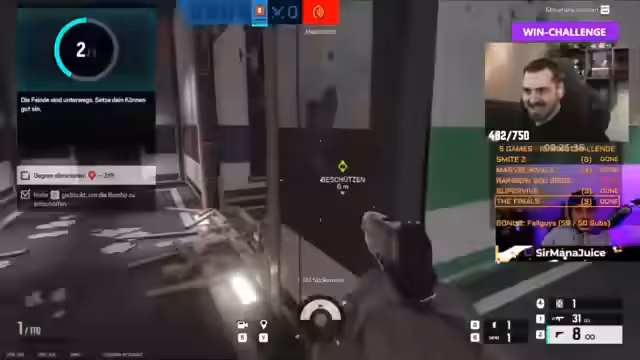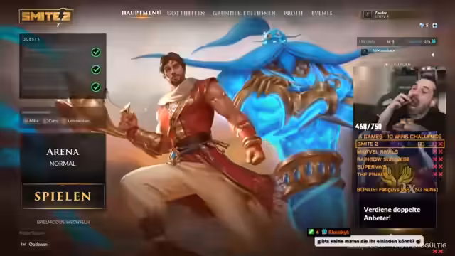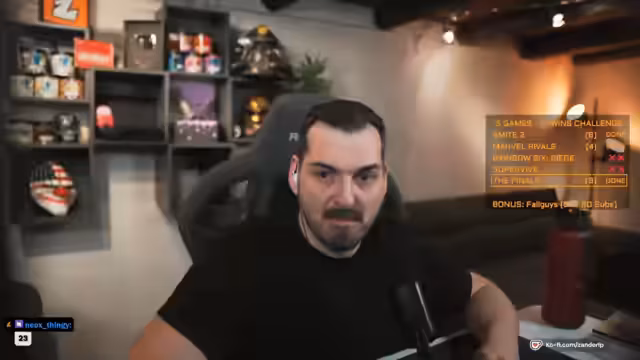 00:02:22Der Streamer startet eine gemeinsame Übertragung mit dem Kollegen Sirmanajuice und nutzt dafür die neue Stream-Funktion von Twitch. Sie planen eine Win-Challenge, bei der sie in verschiedenen Spielen Erfolge erzielen müssen. Die Challenge umfasst die Spiele Smite 2, Marvel Rivals, Rainbow Six Siege, Vive und The Finals. Zusätzlich wird bei erreichen bestimmter Abonnement-Ziele ein Bonusspiel aktiviert: bei 50 Subs für Zander und bei 20 Subs für Sirmanajuice wird Fall Guys freigeschaltet.