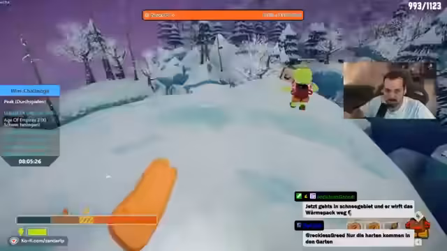 03:50:32Im abschließenden, besonders heiklen Abschnitt führen Schneestürme und der Verlust von Rucksackinhalten zu einer fatalen Situation. Ein Streamer stürzt in den Tod und wird vom anderen wiederbelebt. Eine strategische Fehlentscheidung führt dazu, dass der wichtige Rucksack in einer Klemme verloren geht, was den Run endgültig scheitern lässt und zu Frustration führt.