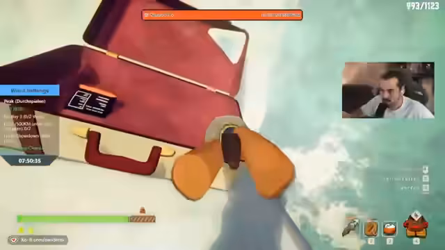 00:34:48Nach dem Fall Guys-Spiel wird zu Peak gewechselt, einem Survival-Kletter-Game. Die Herausforderungen beginnen sofort: Rucksäcke müssen gepackt und Ressourcen wie Studentenfutter oder Seile gesammelt werden. Das Ziel ist es, einen Berg zu erklimmen. Das Gameplay wird als anspruchsvoll beschrieben, da Ausdauer, Hunger, Gifte und Hindernisse den Fortschritt behindern und Teamarbeit essenziell ist.