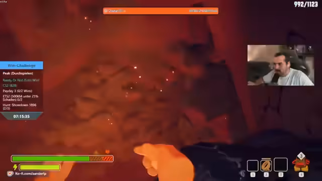05:12:36Nachdem der schwierige Vulkan erfolgreich überwunden wurde, führt der Ausstieg durch einen Kletterabschnitt mit einem Seil, was die letzte Herausforderung darstellt. Nachdem der Abstieg gemeistert ist, feiert das Team den gewonnenen Kampf gegen das harte Spiel. Ein künftiges Elden Ring Koop-Abenteuer ist bereits geplant. Die grobe Bilanz der bisherigen Challenge wird gezogen und der immense Zeitaufwand für die noch verbleibenden, sehr anspruchsvollen Spiele wird betont, während der Erfolg in Peak als Höhepunkt gefeiert wird.