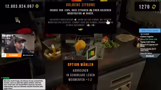 12:15:14Es werden verschiedene Items im Spiel analysiert und deren potenzieller Nutzen bewertet. Dabei wird überlegt, welche Items für die aktuelle Strategie am wertvollsten sind und welche eher hinderlich. Es wird entschieden, bestimmte Items zu kaufen, um die Wahrscheinlichkeit auf höhere Gewinne zu erhöhen. Die Strategie wird kontinuierlich angepasst, um das Maximum aus den vorhandenen Ressourcen herauszuholen. Ein besonderes Augenmerk liegt auf der goldenen Zitrone und wie sie in die Gesamtstrategie passt. Es wird auch überlegt, ob es sinnvoll ist, bestimmte Deadlines zu überspringen, um zusätzliche Vorteile zu erhalten. Das Ziel ist es, ein optimales Setup zu schaffen, um möglichst hohe Gewinne zu erzielen.