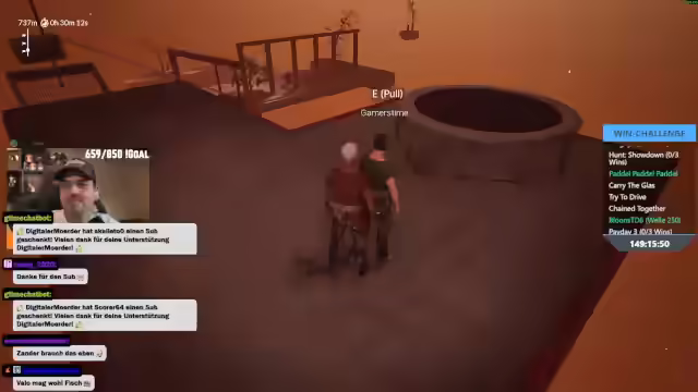 06:27:35Der Streamer und G-Time beginnen das Spiel Chain Together zu erkunden, wobei sie die Mechaniken des Spiels testen, wie das gegenseitige Hochziehen und die Auswirkungen von Stürzen. Es wird festgestellt, dass ein Spieler den anderen retten kann, wenn dieser fällt, was an God of War erinnert. Die Schwierigkeitsgrade Normal und Lava werden erwähnt. Durch das gemeinsame Spielen und Ausprobieren der Spielmechaniken entsteht eine unterhaltsame Dynamik. Es wird auch überlegt, wann wer springt, um Hindernisse zu überwinden. Das Ziel des Spiels, aus der Hölle zu entfliehen, wird ebenfalls thematisiert. Die anfängliche Erkundung des Spiels, gepaart mit humorvollen Kommentaren und der Interaktion der Spieler, sorgt für eine lockere und unterhaltsame Atmosphäre.