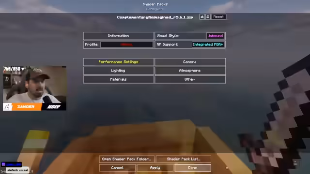 03:50:17Der Streamer stellt seinen Shader-Pack, den 'Complimentary Reimagined', vor, den er als 'geil' beschreibt. Er erwähnt die hohe Render-Distanz von 72 Chunks und das Bobby-Mod, das das Spiel flüssiger macht. Bei der Entdeckung eines Wüstentempels, das eigentlich in einer Wüste spawnen sollte, ist das Team erstaunt. Sie finden einen Brewing-Stand und entscheiden, ihn mitzunehmen. Sie diskutieren auch über die Nutzung einer XP-Farm von Hand of Blood und planen, später dorthin zu gehen.
