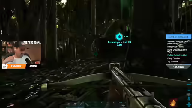 03:54:50Nachdem ein Fernglas hergestellt wurde, beginnt die Suche nach einem geeigneten Triceratops. Ein Pteranodon (Level 140) wird entdeckt und als potenzielles Zähmungsziel ins Auge gefasst. Während einer der beiden Streamer versucht, das Tier im Auge zu behalten, bereitet der andere die Ausrüstung für die Zähmung vor. Es wird über die Schwierigkeit gesprochen, das Tier in den dichten Bäumen nicht aus den Augen zu verlieren. Es wird festgestellt, dass das Tier wild und männlich ist. Es wird Narkotik in das Tier gelegt. Es wird erklärt, dass der Bonus-Stat verloren geht, wenn das Tier angegriffen wird. Es wird Prime Meat besorgt, damit die Zähmung schneller geht. Es wird über das Aussehen des Tieres gesprochen und festgestellt, dass es einem Außerirdischen ähnelt.