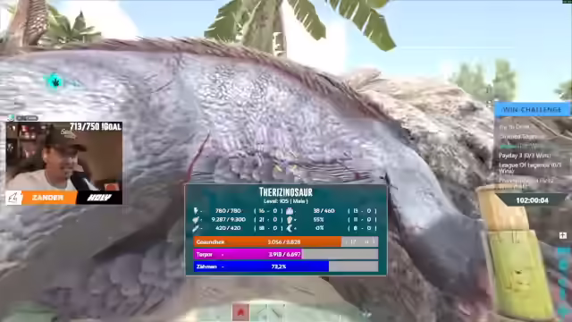05:08:08Ein 90er Theri wird gesichtet und als wertvoll eingestuft. Es wird besprochen, wie man Zander, der neu im Spiel ist, Aufgaben gibt, um ihn mit dem Spiel vertraut zu machen. Es wird der Plan gefasst, Narcobären zu farmen, um Teris zu zähmen und Artefakte zu sammeln. Ein Trike Level 40 soll betäubt werden, um Bonuslevel zu erhalten und schnell an Narko-Beeren zu gelangen. Es wird erklärt, wie man Pfeile auf die Armbrust zieht und auf die Beine des Dinos schießt, um den Torpor zu erhöhen. Der Dino wird auf Passiv gestellt, um Angriffe zu vermeiden. Es wird besprochen, wie man Mejo-Beeren in den betäubten Dino legt und wie man Pflanzen pflückt, während der Dino betäubt ist. Es wird erwähnt, dass ein großes Update auf dem Play-Legend-Server kommt, das Tag-Nacht-System, Wetter-System und Wind ins Spiel bringt. Die Auswirkungen des Windes auf das Angeln und die verschiedenen Wetterzustände werden erläutert.