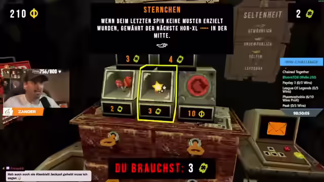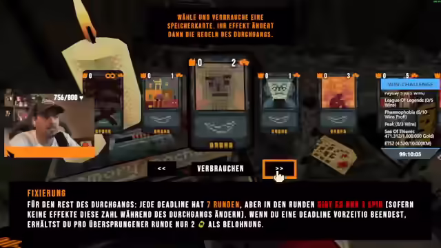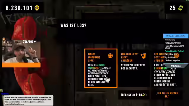 10:44:58Es wird eine Strategie basierend auf Glücksbringern und der Zitronenkarte erläutert, um Jackpots zu maximieren. Durch das Aufladen jeder Runde und die Erhöhung der Wahrscheinlichkeit durch die Zitronenkarte in Kombination mit Glücksbringern, die das Glück erhöhen, konnte in jeder Runde ein Jackpot erzielt werden. Der Wert der Zitronenkarte wurde nach jeder Runde gesteigert, was zu einer "geisteskranken Runde" führte. Es werden verschiedene Spielmechaniken und Effekte von Glücksbringern beschrieben. Dazu gehört die Möglichkeit, von Anfang an bis zu 21 Spins zu wählen, mehr Tickets zu erhalten und mit 27 Credits und 5 Tickets zu beginnen. Es wird erwähnt, dass man mit 12 Tickets startet und für den Rest des Durchgangs keine Tickets mehr verdient, es sei denn, Effekte ändern dies. Die Möglichkeit, am Anfang viele "geile" Glücksbringer zu kaufen, wird hervorgehoben, ebenso wie Speicherpakete, die zusätzliche Vorteile bieten. Allerdings gibt es auch Nachteile, wie das zufällige Verwerfen von Glücksbringern bei sechs oder mehr ausgerüsteten Glücksbringern am Ende einer Deadline, was zu zwei Gratisauffüllungen im Shop führt. Ebenso werden Effekte wie doppelt so hohe Schulden, die Chance auf einen goldenen Knauf und veränderte Hinterhältig-Eigenschaftschancen thematisiert. Ab der dritten Deadline ist garantiert, dass in der letzten Runde jeder Deadline mindestens eine 666 erscheint, wobei bestimmte Glücksbringer verboten sind, die im Terminal eingesehen werden können. Die Zuschauer werden nach ihrer Meinung zu den verschiedenen Karten gefragt, um die nächste Spielstrategie festzulegen.