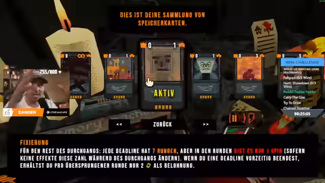 10:43:58Nach der enttäuschenden Runde werden die sogenannten „Memory Cards“ vorgestellt, die die Spielregeln für den gesamten Durchgang ändern. Der Streamer liest die Effekte verschiedener Karten vor, wie z. B. eine Reduzierung der Glücksbringer auf drei, aber Start mit zwei Gratisauffüllungen, oder Deadlines mit nur einer Runde dafür aber bis zu 21 Spins. Nach der Abstimmung mit dem Chat wird die „Fixierung“-Karte gewählt.