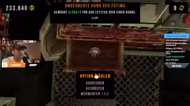13:38:34Es wird festgestellt, dass der letzte Knochen nur durch eine 666 zu bekommen ist und überlegt, die Doppelkirschen-Geschichte wegzuschmeißen, was das ganze Spiel brechen könnte. Es wird der Schuh gefunden. Es wird festgestellt, dass man jetzt eine 61-prozentige Wahrscheinlichkeit hat, immer Kirschen-Jackpot zu bekommen. Es wird überlegt, ob der Pilz besser als die Fatima ist und entschieden, dass der Pilz besser ist, weil er den Wert verdoppelt. Es wird die antike Münze erwähnt. Es wird überlegt, die vier extra Tickets zu holen, um den Multiplikator zu erhöhen. Es wird ein Item gefunden, das die Karte auflädt. Es wird überlegt, ob man den Platz des Glücksbringers erhöhen oder Kirschen erscheinen lassen soll. Es wird entschieden, den Glücksbringerplatz zu erhöhen. Es wird festgestellt, dass man immer nur einen Spin haben darf, weil der Kristall in der ersten Runde ausgelöst wird und die Hand in der letzten Runde. Es wird überlegt, den Joker wegzuschmeißen, um Platz zu schaffen.