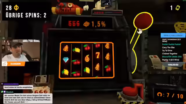 10:33:30Zu Beginn des Abschnitts wird die geringe Wahrscheinlichkeit, das wertvollste Symbol (die Zitrone) zu bekommen, kritisiert. Der Streamer nennt das Spiel „richtiger Müll“ und untersucht verschiedene Glücksbringer, darunter eine „Gratisauffüllung“ und einen „Jackpot-Verdoppler“. Eine riskante Kombination mit einer Katze, die die Zinsen um 3% erhöht, wird gewählt, was einen Jackpot von 5 Millionen bringt, aber die Gefahr eines Scheiterns der Runde birgt.
