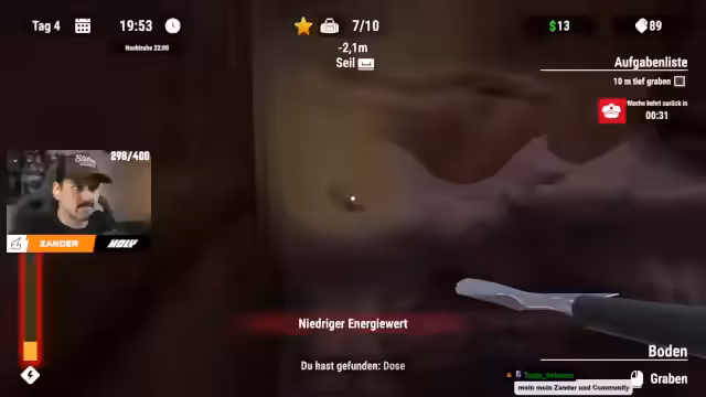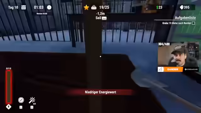 01:16:18Nachdem der Streamer grundlegte Ressourcen und eine Verbesserung der Schaufel erworben hat, vertieft er sich in das Spiel. Er findet einen Brief mit Informationen über ein verschlossenes Lager und sucht den Schlüssel. Durch wiederholtes Graben und Handel steigert er seine maximale Energie. Er identifiziert die Reinigungskraft als gefährliche Figur und plant, mit ihr über eine Zellenerweiterung zu verhandeln. Sein Ziel ist es, tiefer zu graben, um wertvollere Gegenstände und den Weg zum Lager zu finden.