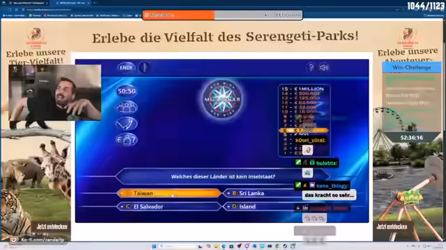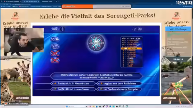 06:57:12Der Streamer wechselt zu einem Quiz-Format und spielt 'Wer wird Millionär?'. Er beantwortet verschiedene Fragen aus unterschiedlichen Wissensgebieten wie Geschichte, Geografie und Allgemeinwissen. Dabei zeigt er sowohl beeindruckende Kenntnisse als auch humorvolle Unsicherheit bei manchen Fragen. Die Atmosphäre ist locker und unterhaltsam, mit gelegentlichen Kommentaren zur Schwierigkeit der Fragen.