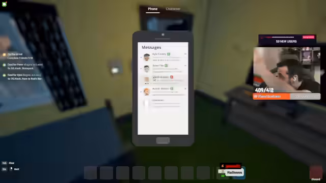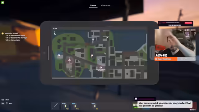 00:29:53Während des Streams wird ein Zuschauer namens Skunky in die Spielwelt eingeladen, um gemeinsam im Koop-Modus zu spielen. Die beiden schlüpfen in die Rollen von Drogendealern und beginnen mit dem Aufbau ihres illegalen Imperiums. Sie kaufen ein Motelzimmer, um dort eine erste Verpackungsstation einzurichten, und lernen schrittweise die Mechaniken des Verkaufs und der Ernte. Gemeinsam sammeln sie auch erste Erfahrungen mit Schulden bei ihren Lieferanten und strategischen Geschäftsentscheidungen.