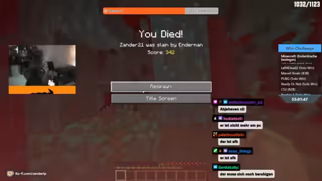 05:02:08Nachdem der Streamer und sein Begleiter ins Nether-Portal gestiegen sind, um eine Festung für die End-Challenge zu finden, erleben sie extremes Pech. Sie legen tausende Blöcke zurück und stoßen nur auf unpassende Biome wie einen Crimson Forest und ständige Bastionen. Ein Fehler führt zum Tod und zum Verlust aller Ausrüstung und Enderperlen, was die Situation weiter verschärft und die Motivation stark sinken lässt. Die Suche fühlt sich an wie ein bodenloses Desaster.