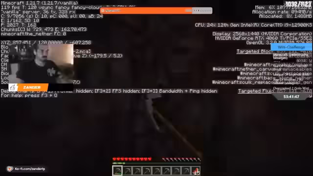 02:57:59Die Suche nach den notwendigen Ressourcen im Nether gestaltet sich als extrem schwierig. Das Spawn-Biom ist eine Kombination aus Soul Sand Valley und Basalt-Delta, was die Fortbewegung stark verlangsamt und die Suche nach einer Festung für Blaze-Pulver erschwert. Nachdem wertvolle Ausrüstung verloren geht, wird beschlossen, einen neuen Portal in der Oberwelt zu bauen, um die unübersichtliche Netherlandschaft zu verlassen.