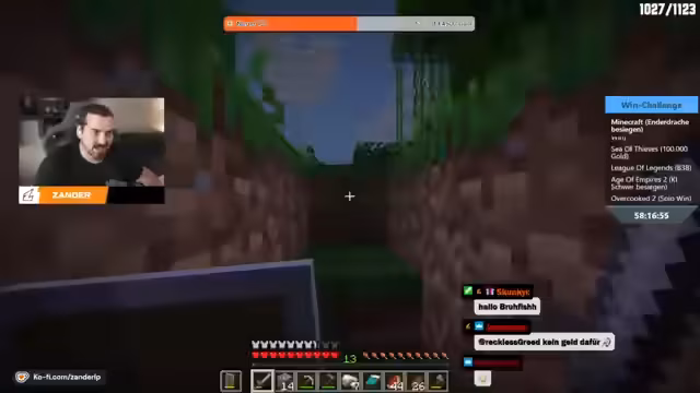 07:43:06Der Stream und sein Partner Zander beginnen mit dem Vorbereitungen für den Enderdrachen-Kampf in Minecraft. Sie planen eine Strategie, bei der einer die Gitter an den Säulen mit Baublöcken abdeckt und der andere diese zerstört, um den Drachen anzugreifen. Sie stellen sicher, dass sie genug Essen und Ressourcen wie Baublöcke und Steinspitzhacken zur Verfügung haben. Außerdem beschließen sie, Bettlebenspunkte direkt am Portal aufzustellen, um nach jedem Tod schnell zum Kampf zurückzukehren und Zeit zu sparen.