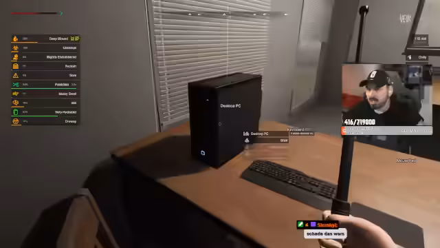 02:11:28Der Streamer und seine Mitspieler erkunden die Welt von Vain. Ihr Ziel ist es, sich an markanten Orten zu treffen. Das Spiel bietet viele Einstellungsmöglichkeiten, wie z.B. die Tageslänge und das Verhalten von Zombies. Die Spieler suchen nach wichtigen Ressourcen wie Waffen, Nahrung und Werkzeugen. Eine wichtige Mechanik ist der Besitz eines Handys, das eine Karte anzeigt. Der Akku kann jedoch auch schnell zur Neige gehen, was eine strategische Entscheidung erfordert.