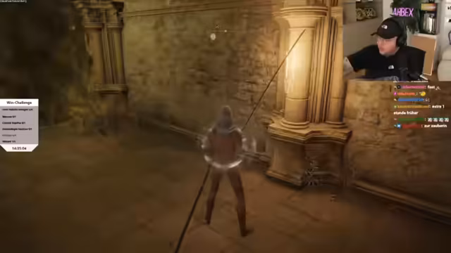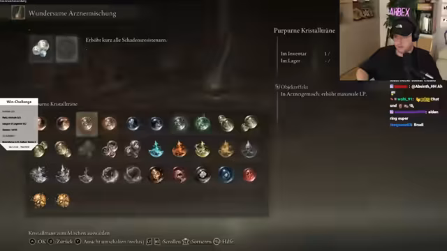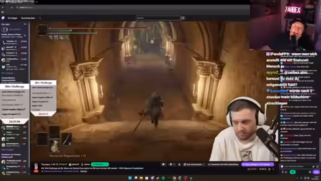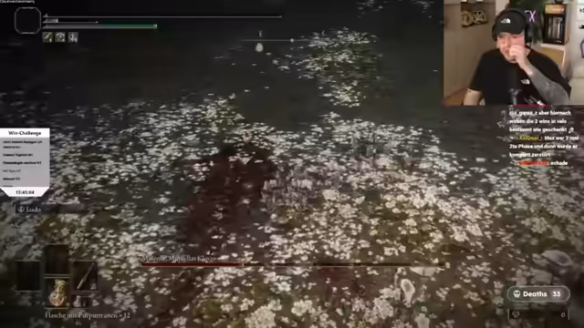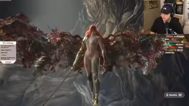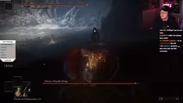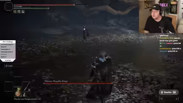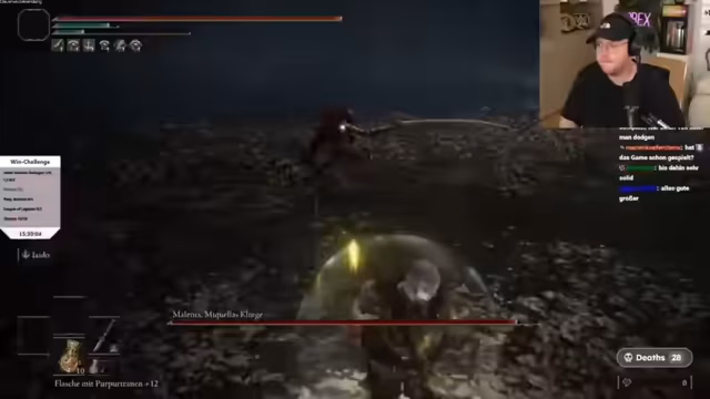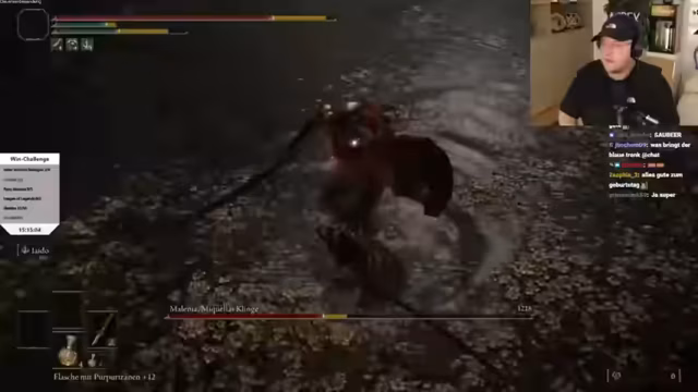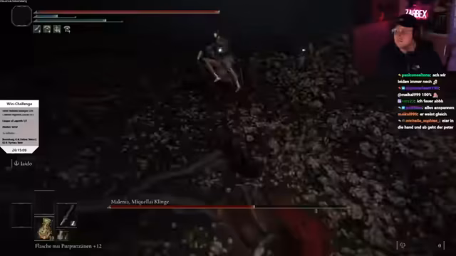 12:42:38Der Streamer kämpft gegen den Boss Malenia in Elden Ring und hat erhebliche Schwierigkeiten. Er erhält Anleitungen vom Chat, muss seine Ausdauer im Auge behalten und versucht, die Angriffe des Bosses zu vermeiden. Mehrfach wird er besiegt und muss seine Taktik anpassen, obwohl er immer wieder auf Probleme mit seinem Controller oder der Spielmechanik stößt.