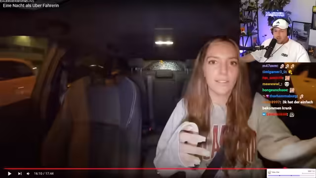01:48:30Ein scheinbar normaler Uber-Ride um 1 Uhr nachts entpuppte sich als eine absichtlich inszenierte Aktion für ein YouTube-Video. Der Streamer und die Fahrerin, eine Influencerin, kannten sich nicht und stellten erst nach 20 Minuten fest, dass sie Teil eines aufwendigen Videos waren. Die Fahrt endete mit einem Trinkgeld als Gag und einer Fünf-Sterne-Bewertung, wobei der Streamer die Format-Ideen für seinen eigenen Stream klaute.