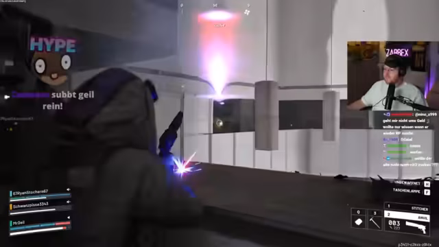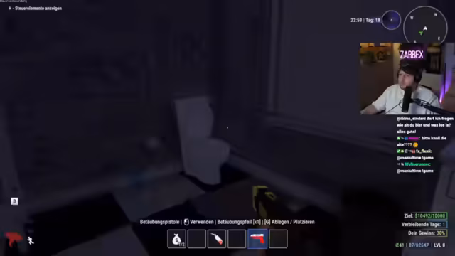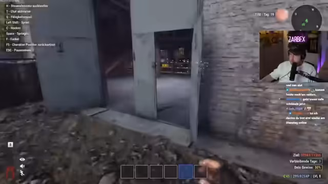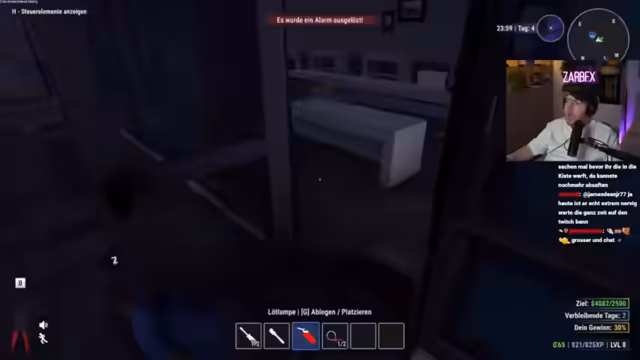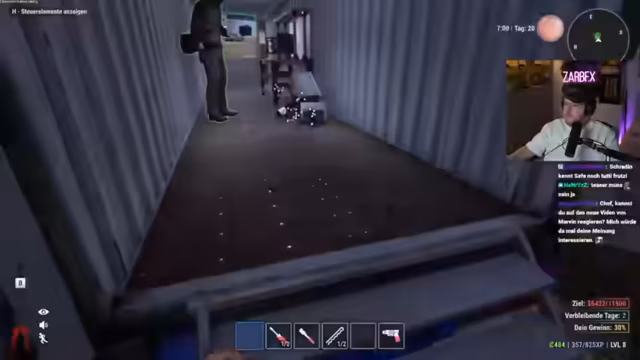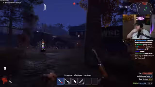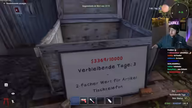 02:03:42Der Stream startet mit einem erfolgreichen Raid auf ein Haus. Das Ziel ist, wertvolle Gegenstände zu finden und in den Truck zu laden, um sie später zu Geld zu machen. Der Streamer betont die Wichtigkeit, sich nicht zu zeigen, und feuert ab. Er und sein Partner Schradlin planen, das gesamte Dorf zu plündern. Der Chat levelt mit, und die Anzeige zeigt bereits 10.000 XP. Die Devise lautet: "Wer es findet, darf es behalten."