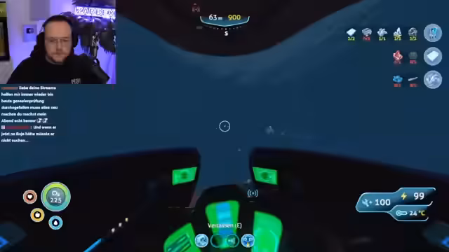 05:55:33Nach dem emotionalen Finale der Traumfrau-Gesucht-Folge wechselt der Stream zu dem Spiel Subnautica. Zuerst wird die getunte MS Geil vorgestellt, mit der es möglich ist, bis in 900 Meter Tiefe zu tauchen. Der Streamer erkundet die Tiefsee, erlebt aber Stress durch feindliche Kreaturen wie große Krabben und das Verschwinden wichtiger Teile wie des Mustangs.