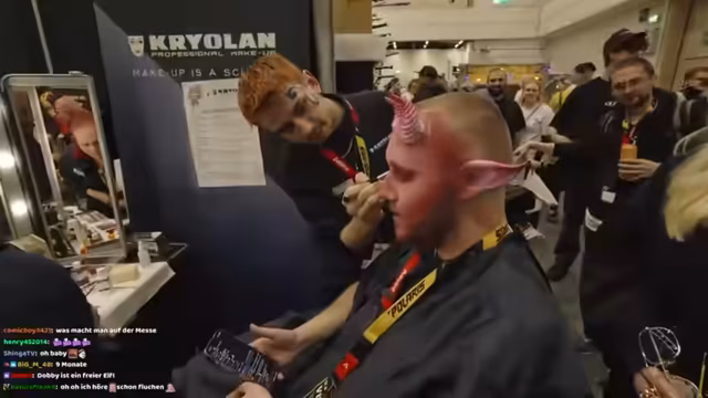 02:55:38Auf der Messe angekommen, äußert der Streamer seine Bewunderung für die aufwändigen und selbstgebastelten Cosplays. Er trifft eine Person, die Ketten und LED-Elemente trägt und einen Preis gewonnen hat. Er teilt mit, dass er seit zehn Jahren cosplayt und durch das Erlernen von Fähigkeiten wie Löten seine Kostüme selbst herstellt. Der Stand von Kryolan wird als Anlaufstelle für professionelles Make-up und Prothesen vorgestellt, wo er und seine Begleitung beraten werden.