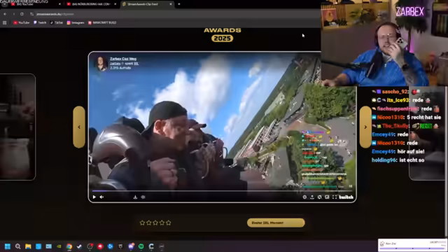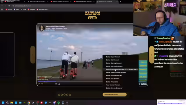 01:50:25Ein Clip vom 'Walrossfangen in Kiel' während der Kieler Woche in Portugal wird als 'erbärmlich' und 'peak asozial' beschrieben, aber auch als 'sehr, sehr geil'. Der Streamer äußert den Wunsch, einen Stream Award in der Kategorie 'Jumpscare' zu gewinnen, da er in diesem Jahr viele Jumpscares in Horrorspielen gefarmt hat. Er würde sich sehr über eine solche Auszeichnung freuen, da er sich 'so gefickt' hat. Die Kategorie 'Bestes Duo' oder 'Bestes IRL-Event' (Camper-Tour) wären ebenfalls wünschenswert, aber Jumpscare hat eine besondere Bedeutung für ihn.