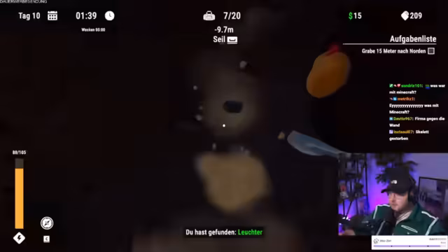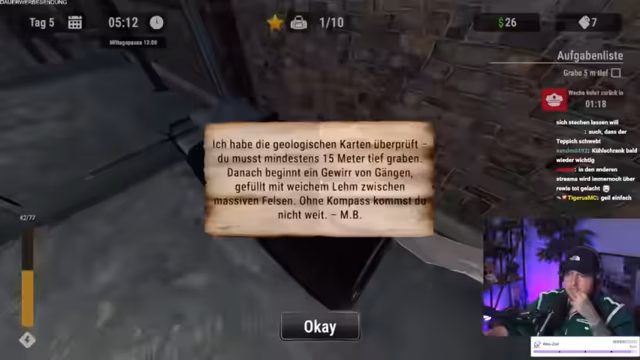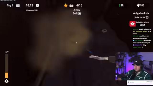 05:51:08Es wird über die Möglichkeit eines Resets der Grabinstrumente im Hardcore-Modus diskutiert. Der Streamer äußert sich über Probleme und knappe Situationen beim Graben und betont die Wichtigkeit von Silbermünzen. Er wundert sich, dass der Wärter keinen Verdacht schöpft, obwohl er täglich einen Flohmarktstand mit exotischen Items aufbaut. Die Freude über eine vernünftige Schaufel wird hervorgehoben, nachdem zuvor mit einem 'verschiebenen Eisstiel' gegraben wurde. Das Ziel ist es, den Schlüssel fürs Lagerhaus zu finden und eine Runde zu schlafen. Es wird erwähnt, dass man mindestens 15 Meter tief graben muss und ein Gewirr von Gängen mit weichem Lehm und Felsen beginnt, wobei ein Kompass benötigt wird. Der Streamer plant, ohne Dynamit zu arbeiten, um Probleme mit den Wachen zu vermeiden und freut sich über den guten Loot und die ausgegrabenen Silbermünzen.