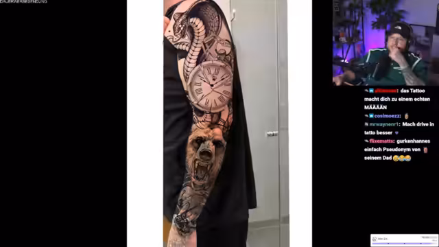 00:17:34Es wird ein neues Tattoo angekündigt, das am Samstag gestochen werden soll. Ursprünglich wollte er es erst nach Fertigstellung zeigen, aber er gibt nun einen Einblick in das geplante Armsleeve-Cover-Up. Ein älteres Tattoo mit Wald und Uhr soll überarbeitet werden, da es in einem Hinterhofstudio schlecht gestochen wurde und sich entzündet hatte. Ein neuer Tätowierer wird den kompletten Arm covern, um ein vollständiges Sleeve bis zur Schulter zu gestalten. Das Motiv wird gezeigt und soll in einer Sitzung durchgezogen werden, auch wenn es schmerzhaft wird. Er ist gespannt, ob der Tätowierer das Cover-Up hinbekommt. Das Tattoo hat eine Bedeutung, die er später erläutern wird. Der Chat äußert Zweifel, ob er die Sitzung durchhalten wird, aber er ist entschlossen, es zu versuchen. Der Influencer-Bonus wird womöglich genutzt, um die Kosten zu decken, da er mit dem Tätowierer befreundet ist.
