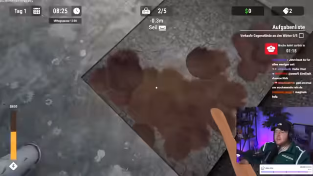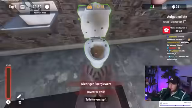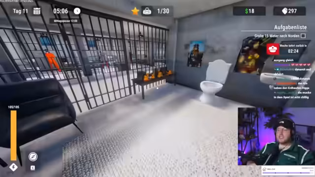 04:29:23Der Streamer beginnt seinen Tag im Spiel mit dem klaren Ziel, das goldene Scheißhaus zu ergattern, welches ihm Knastrespekt und günstigere Items von den Knastinsassen verschaffen soll. Er findet einen goldenen Barren, das seltenste Verkaufsobjekt, und überlegt, ob er ihn an den Händler oder später an Jeremy verkaufen soll. Nach einigem Hin und Her entscheidet er sich, ihn beim Knastwerter gegen Klopapierrollen einzutauschen. Es folgt ein dramatischer Moment, als er versucht, aus dem Gefängnis zu fliehen, wobei er knapp entkommt und in eine Verfolgungsjagd gerät. Trotz anfänglicher Freiheit scheitert der Fluchtversuch jedoch, als er mit dem Hubschrauber in einen Leuchtturm kracht und im Hochsicherheitsgefängnis landet. Dort muss er mit einem Eisstiel graben und sich mit einem Dixi-Klo voller Sprühschiss zufriedengeben. Der Neustart im Hardcore-Modus gestaltet sich extrem schwierig, da er mit einem Eisstiel graben muss und kaum Gegenstände findet. Er ist frustriert über seine Situation und den Verlust seiner Privilegien. Der Streamer versucht, sich mit Essen und Toilettenpapier über Wasser zu halten, während er von den Mitgefangenen und dem System schikaniert wird. Er trainiert im Spazierhof, um seine Kraft wiederzuerlangen, und versucht, beim Kartenspiel sein Glück zu versuchen, jedoch ohne Erfolg. Trotz aller Widrigkeiten gibt er nicht auf und versucht, sich Respekt zu verschaffen und eine bessere Schaufel zu bekommen.