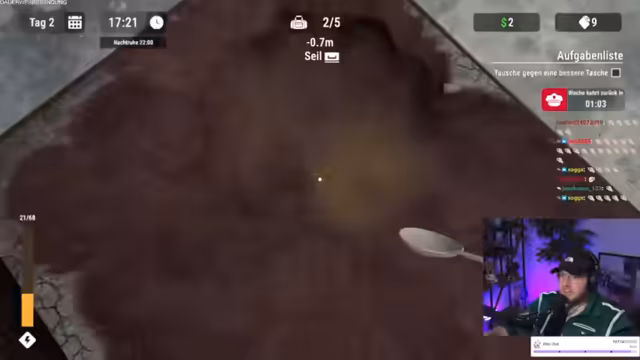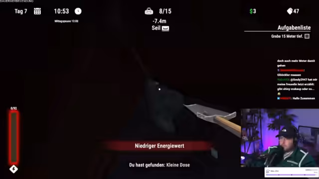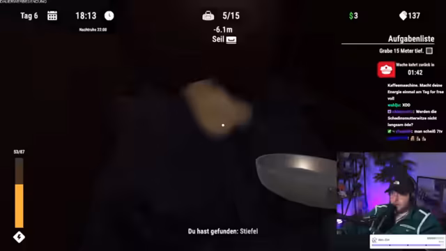 05:03:12Der Streamer benötigt dringend einen Energy Drink, um weitergraben zu können, scheut aber die Geldverschwendung. Er findet wiederholt keine Items und hadert mit seinem Schicksal im Hochsicherheitsgefängnis. Er bedankt sich bei seinen Zuschauern für die Treue und die Bits. Er braucht dringend eine Schaufel, um voranzukommen. MegaMiao motiviert ihn mit ihrem Support, weiterzugraben und auf die Schaufel zu sparen. Er findet die Schere, die er für eine Quest benötigt und bedankt sich bei Rolli-Mann für die Subs. Der Streamer ist wieder guter Dinge und will auf die Schaufel grinden. Er erinnert sich an frühere Zeiten mit Mega-Miau und bedankt sich für den Support. Er betont, dass er sich sehr über den Support freut, die Zuschauer aber auch an sich denken sollen. Der Streamer versucht sein Glück beim Kartenspiel, muss sich aber eingestehen, dass er etwas zu gierig war. Er hat aber wieder gute Laune und gräbt weiter. Er bemerkt, wie langsam das Graben mit dem Löffel im Vergleich zu den besseren Schaufeln ist. Er bedankt sich bei Marv für die Sub-Bombe und kauft sich noch etwas zu essen, um über Nacht weiterbuddeln zu können.