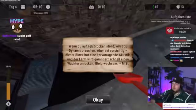 03:39:10Der Streamer beginnt mit dem Prison Break Simulator und konzentriert sich darauf, seine Zelle auszustatten und Fluchtpläne zu schmieden. Er sammelt Ressourcen, verkauft Gegenstände und buddelt einen Tunnel in Richtung Norden, um aus dem Gefängnis auszubrechen. Der Streamer interagiert mit dem Chat, beantwortet Fragen zu Minecraft und Card-Dealer-Simulator und erklärt seine Motivation, verschiedene Simulator-Games auszuprobieren. Er plant, den Nightclub-Simulator mit Schradin und Monte fortzusetzen und betont die Bedeutung von Variety-Content. Der Streamer buddelt weiter, sammelt Geld und plant, sich einen größeren Rucksack zu kaufen, um die Flucht zu erleichtern. Er wartet auf die Nachtruhe, um ungestört weitergraben zu können, und bedankt sich für die Unterstützung durch Prime Subs.