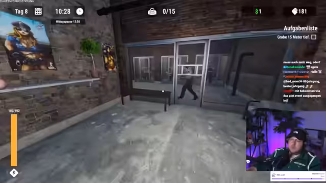 05:18:50Der Streamer kündigt eine Oktoberfest-Tour mit Schradin an und freut sich auf das Event. Er findet endlich wieder Items beim Graben und buddelt eine Day-Date von Marc Gebauer aus. Er muss sein Scheißhaus pömpeln, da es dicht ist. Der Streamer scherzt über Harald Schnittlaus, der eine Sugar-Mami sucht. Er handelt noch zwei Rollen Klopapier mehr raus und kann sich die bessere Tasche holen. Der Start war holprig mit dem Eisstiel, aber jetzt läuft es besser. Er bedankt sich bei seinen Zuschauern für die Bits. Der Streamer findet ein Stück Flutschseife und erinnert sich daran, dass er noch eine Schere hat. Er betont, dass das Quest-Item immer gesaved ist und man es nicht automatisch verkauft. Er bedankt sich bei seinen Zuschauern für die Subs. Der Streamer erklärt, dass er sich im Hochsicherheitstrakt befindet, nachdem er aus dem ersten Gefängnis ausgebrochen ist. Er kann sich jetzt Essen und einen Rucksack kaufen. Der Streamer beklagt sich darüber, dass der Wärter die Zelltür wieder zumacht, obwohl Mittagspause ist. Er wird beim Bankdrücken von einem anderen Insassen angemacht und fühlt sich benutzt. Er versucht, beim Kartenspiel die richtige Karte aufzudecken und trickst das System aus. Der Streamer überlegt, ob er während der Mittagspause graben kann, ist aber zu dumm, sich einen Energy Drink zu kaufen und wird erwischt.