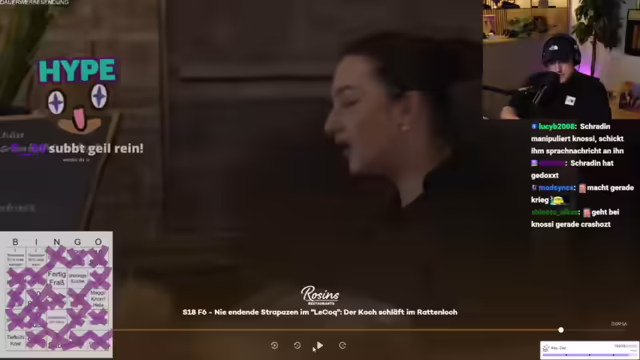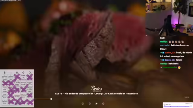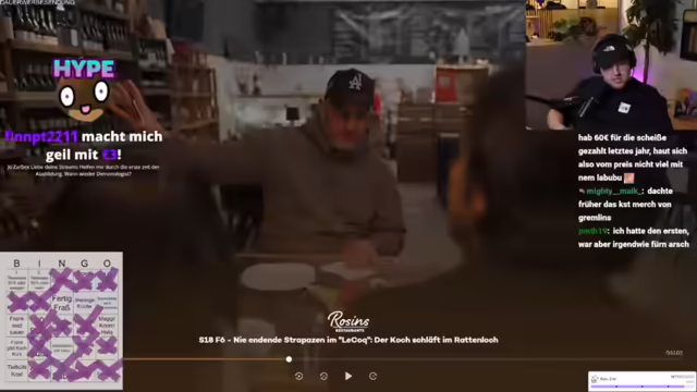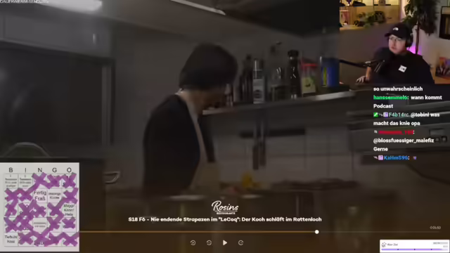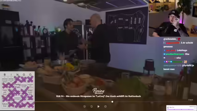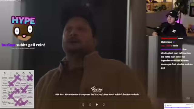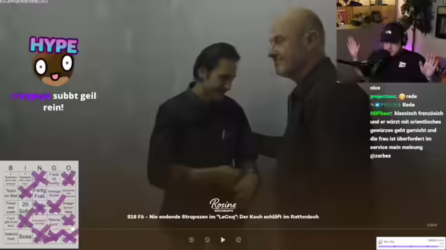 01:58:37Der Streamer bereitet sich auf das Frank Rosin Bingo vor und betont die Wichtigkeit des "geldgeile Betrüger"-Feldes als Jokerfeld. Er erinnert sich an vergangene Bingo-Sessions und plant, das Spiel mit den Zuschauern zu spielen. Dabei werden verschiedene Felder wie "dreckige Küche", "Alufolie", "Fertigfraß", "Team im Bild", "Sternekoch", "Schulden", "Frank wird sauer", "Jemand raucht", "Soße", "Tiefkühlkost", "Speisekarte wird überarbeitet", "Frank gibt Kochkurs" und "Quereinsteiger" berücksichtigt. Er diskutiert mit dem Chat über die Auswahl der Felder und passt diese an, um die Spannung und den Spaß am Spiel zu erhöhen. Nach langer Zeit freut er sich darauf, wieder Frank-Rosin-Bingo zu spielen und erwähnt, dass er auch mit Frank Rosin geschrieben hat, der ihm mitteilte, dass eine neue Folge bald erscheinen wird.
