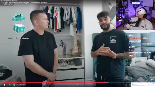 06:33:21Das Gespräch über Hypes in der Musikszelle führt der Streamer zu Capital Bra, den er als Deutschrapper mit dem bisher größten Hype bezeichnet. Er gibt Einblicke in die Entstehung seines aktuellen Albums, das aus 27 Songs besteht, und erklärt, dass er von einem roten Faden geleitet wird. Beim Betrachten seiner Wohnung äußert er sich positiv über den Charakter und die stilvolle Einrichtung. Er betont, dass die Wohnung gemütlich sei und sich lebendig anfühle, und lobt die Einrichtung, die seiner Meinung nach von einer Frau oder einem schwulen Manne geprägt sein muss. Er berichtet auch von der Geburt seines Sohnes und wie das Familienleben in der kleinen Wohnung anstrengend ist.