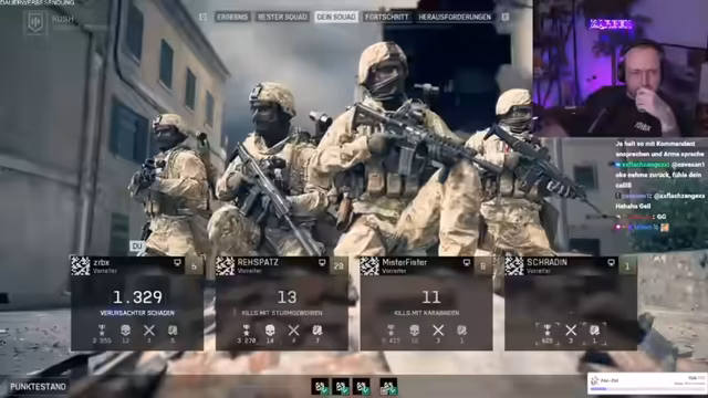 01:22:37Die Gaming-Session beginnt mit viel Action und taktischen Herausforderungen. Der Streamer agiert als Medic und versucht, seine Mitspieler am Leben zu erhalten, während er selbst unter Feuereifer gerät. Er gibt Tipps zur Waffenanpassung, wie zum Beispiel die Wichtigkeit eines Schalldämpfers, um nicht auf der Minimap aufzufallen. Das Team kämpft, um die Flaggen A und B zu verteidigen, während Schradin, ein unerfahrener Spieler, oft im_spawn bleibt oder stirbt, was zu humorvollen Kommentaren führt.