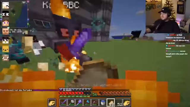 03:19:24Während des Baus eines Weihnachtsbaums in FitnaCraft kommt es zu Spannungen auf dem Server. Neusi und sein Team bauen den Baum bewusst asymmetrisch, um natürlicher auszusehen, und planen, ihn mit bunten Blöcken zu verzieren. Parallel dazu bricht ein Konflikt mit den 'Banditen' um Spieler wie Rort aus. Neusi und seine Verbündeten wie Kato und Marcel verteidigen sich gegen Angriffe im Wasserbereich des Servers. Es entstehen Diskussionen über die Ausrüstung der Gegner, darunter Netherite-Rüstungen, und ob diese fair ist. Neusi bezeichnet seine Gruppe als 'Hunde' oder 'Bastarde', die loyal zueinander stehen, während externe Angreifer wie Rort als 'feuchte Banditen' beschimpft werden.