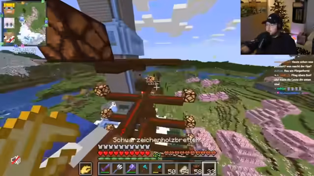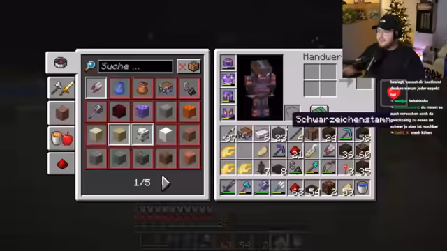 01:13:36Der Streamer hat einen großen Fehler gemacht: Statt Netherite-Rüstung zu upgraden, verzierte er Diamant-Rüstung mit Netherite und verbrannte sie. Grund war Migräne-Flash nach ARK-Sessions. Trotzdem sieht die Rüstung optisch geil aus. Redstone wird für blinkende Weihnachtsbaumkugeln genutzt. Monty wird um Redstone gebeten, der es zur Verfügung stellt.