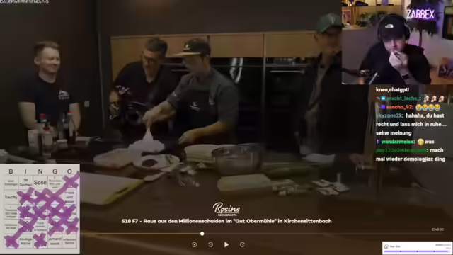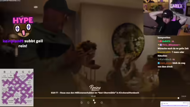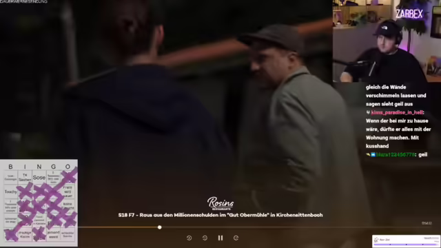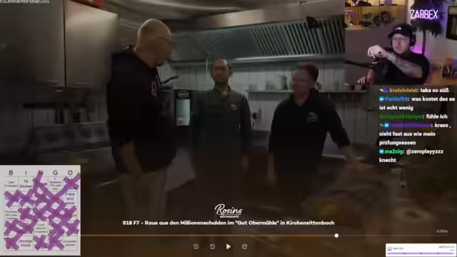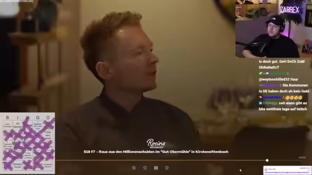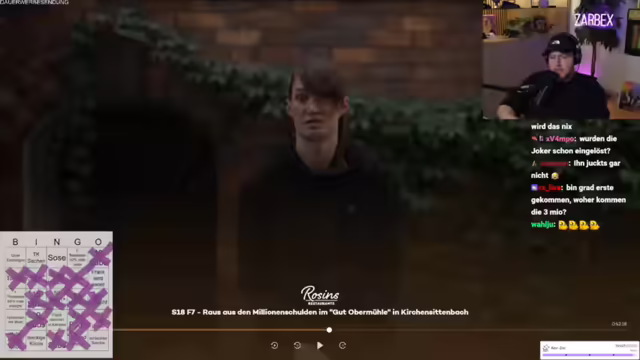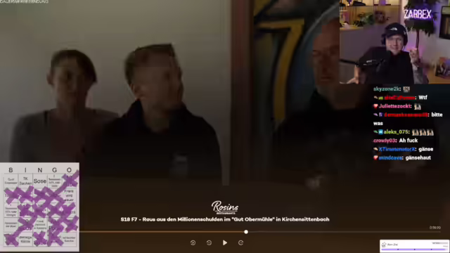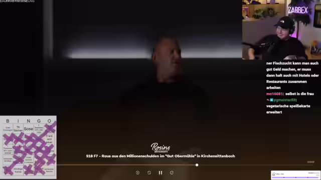 00:38:06Es wird die neue Folge von Rosins Restaurants gestartet. In der Sendung geht es um Alexander, der einen Gutshof übernommen und sich mit 1,2 Millionen Euro verschuldet hat. Seine Eltern haben ihr Eigenheim verkauft, um ihn zu unterstützen. Frank Rosin möchte Alexander unterstützen. Der erste Eindruck des Hofes ist negativ, er wirkt wie ein Lost Place. Rosin trifft auf Alexander und seine Freundin Jessica. Es wird über die Größe des Grundstücks gesprochen (10 Hektar). Rosin hat einen Kulturschock. Der Streamer kommentiert die Situation und äußert Bedenken bezüglich der Finanzen und des Zustands des Hofes. Es wird ein Bingo-Spiel zur Sendung gestartet.