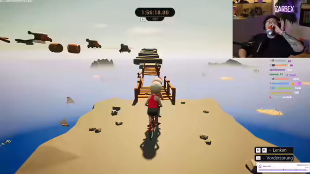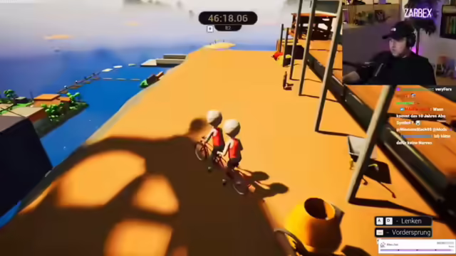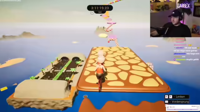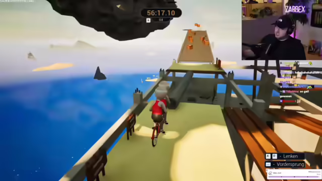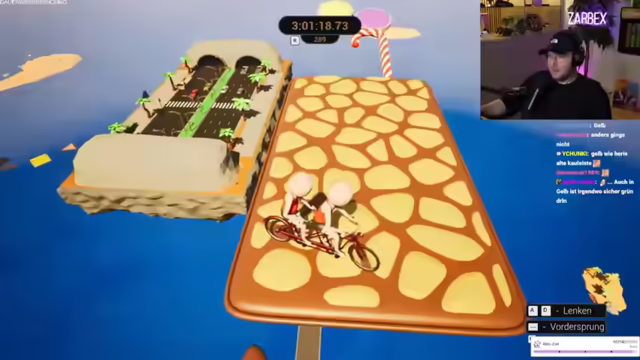 06:58:38Die Spieler erkennen, dass sie sich im richtigen Winkel auf einem gelben Bereich ausrichten müssen, um erfolgreich zu sein. Ein neuer Ansatz wird ausprobiert: Mit Anlauf in einem bestimmten Winkel springen. Dieser Versuch führt endlich zum Erfolg, und sie erreichen die nächste Plattform, die als "Fertigfuchs-Mini-Würstchen" bezeichnet wird. Erleichterung macht sich breit, da dieser Abschnitt als der bisher schwierigste empfunden wurde. Trotz zahlreicher Abstürze und Resets machen die Spieler Fortschritte und erreichen die Zuckerkette. Sie navigieren vorsichtig durch unebenes Gelände und konzentrieren sich darauf, nicht herunterzufallen. Es kommt zu Diskussionen über Unebenheiten und Hautunreinheiten, die jedoch schnell beigelegt werden, um den Fokus nicht zu verlieren.