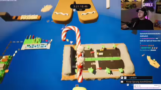 07:19:54Die Spieler stehen vor der Herausforderung, auf Kaugummis zu landen, die sie hochbouncen. Sie justieren ihre Position und versuchen, mit etwas Anlauf hochzuspringen. Nach mehreren Versuchen erreichen sie einen Checkpoint, was für Erleichterung sorgt. Das Ziel, ein Ballon, ist in Sichtweite. Es kommt zu einer hitzigen Diskussion über die korrekte Aussprache von "Ballon". Trotz der Ablenkung konzentrieren sie sich darauf, die Lebkuchenstange zu erreichen. Nach einigen Fehlversuchen finden sie das richtige Timing für den Sprung und erreichen die nächste Plattform. Die Spieler erkennen, dass sie immer das richtige Timing für den Sprung finden müssen, wobei es besser ist, zu früh als zu spät zu springen. Sie experimentieren mit verschiedenen Anläufen und Winkeln, um die Duplos zu überwinden.