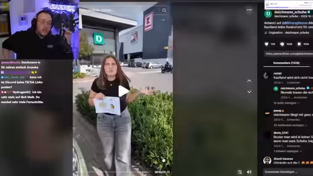 06:20:06Der Streamer kündigt an, dass er jetzt in ein Placement-Segment übergeht und fürstlich dafür bezahlt wird, auf ein Event zu reagieren, bei dem sich verschiedene Firmen auf TikTok beefen. Er erklärt, dass die Marken auf TikTok außer Rand und Band sind und sich in den Kommentaren dissen. Das Event geht in die Richtung von Schlag den Rab. Er wird sich die Kampfansagen auf TikTok ansehen, um in die Lore einzusteigen und zu checken, wer Beef mit wem hat. Der Streamer erwähnt, dass Deichmann vor ein paar Wochen in seinen Chat gekommen ist und 50 Subs gegiftet hat, um ihn zu bestechen. Er findet es crazy, dass die Social Media Manager von diesen Firmen so am Wildern sind und Marketing auf ein neues Level gebracht haben. Der Streamer erwähnt den Duolingo-Vogel bei den Streamer Awards, der mit einem Schwert auf der Bühne getanzt hat. Er wird sich die Playlist mit den Kampfansagen chronologisch ansehen. Der Streamer kommentiert die Kampfansagen zwischen Deichmann, Rewe, ProSieben, Esso und Telekom. Er erwähnt, dass der Opera GX-Account auf Twitter auf Mutter gegangen ist, als er gesagt hat, er findet den Browser kacke. Der Streamer erzählt von seinen Kindheitserinnerungen mit Deichmann und dass es damals ein Fluch und ein Segen zugleich war.