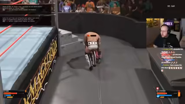 03:46:41Nachdem mehrere Polizeieinsätze verarbeitet wurden, wechselt der Stream vollständig das Thema. Der Streamer beginnt mit dem Spielen von WWE 2K26. Er hat sich für den Showcase-Modus entschieden, der den Werdegang von CM Punk nachzeichnet. Er teilt seine Begeisterung für den Wrestler, von der Zeit seiner Feindschaft als Kind bis zu seiner heutigen Bewunderung und erzählt von prägenden Momenten wie einem Cage-Match. Die ersten Versuche, ins Spiel einzusteigen und die Steuerung zu meistern, gestalten sich jedoch schwierig, da der Streamer mit der Gamepad-Steuerung ringen muss und mehrmals getappt wird.