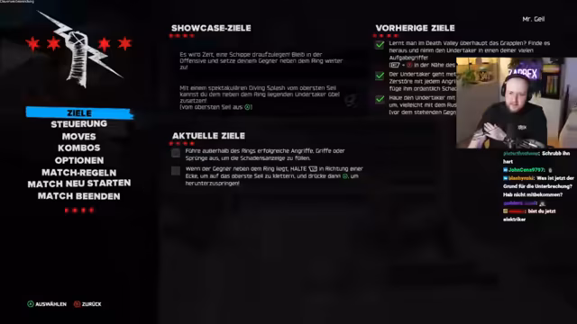 04:09:21Nach diversen Kämpfen und der Nutzung von Stühlen als Waffe konzentriert sich der Streamer auf die Mission, einen Elbow-Drop vom obersten Seil auszuführen. Gleichzeitig versucht er, einen Konter für den GTS, seinen Finisher, zu finden. Trotz wiederholter Angriffe und Versuche gelingt es ihm nicht, die Mission erfolgreich abzuschließen. Die Gegner kontern seine Moves fortwährend und er wird aus dem Ring geworfen, was den Spielverlauf zusätzlich erschwert. Er ist frustriert über seine eigenen Fehler und die nicht intuitive Steuerung.