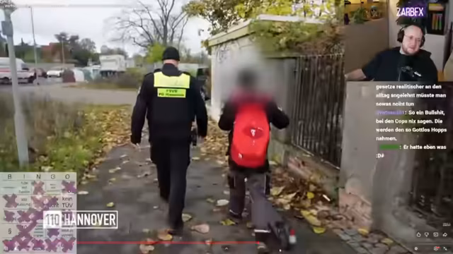 02:31:00Die Szenen wechseln zur Serie "110 Hannover". Eine Polizeistreife erhält den Einsatz wegen einer Dame im Treppenhaus, die sich auffällig verhält und laute Schreie von sich gibt. Die Beamten treffen eine besorgte Nachbarin an, die psychische Probleme bei der Dame vermutet. Die Situation ist heikel, da eine zwangsweise Einweisung in eine psychiatrische Klinik nur unter schwierigen Umständen möglich ist, selbst wenn es bereits Vorfälle gab. Der Streamer reflektiert über die mangelnde rechtliche Unterstützung für Stalking-Opfer.